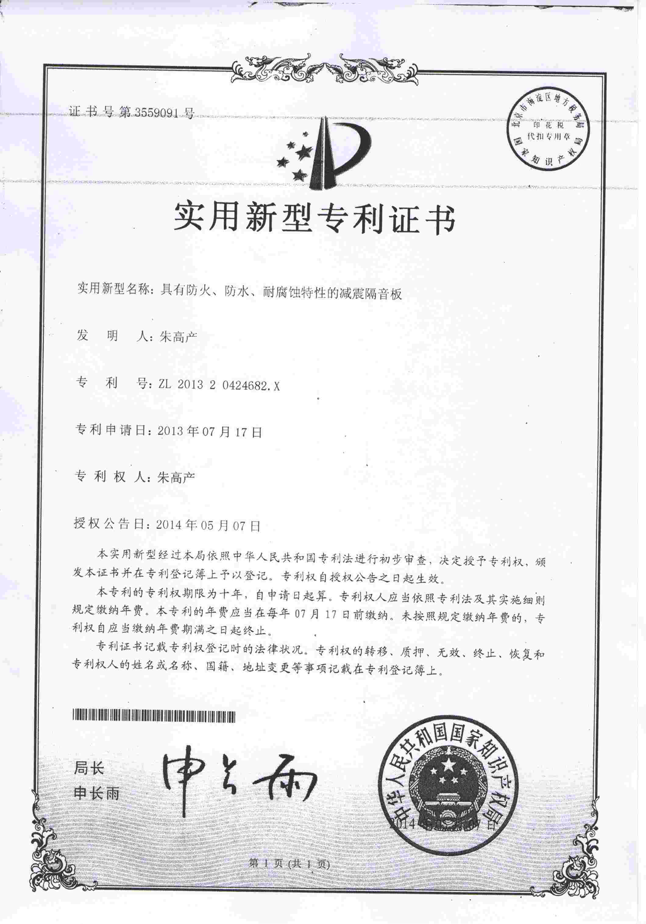 減震隔音板新型專利證書
